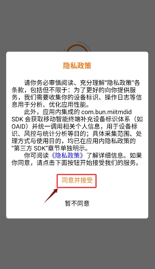 1、首次启动应用需点击同意并接受,确认后即可进入主界面。