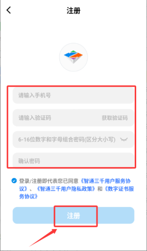 3、在注册页输入手机号验证码密码,勾选协议后注册。