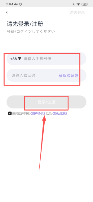 1、于隐私条款弹窗中勾选协议并点击同意,随后进入登录或注册页面。