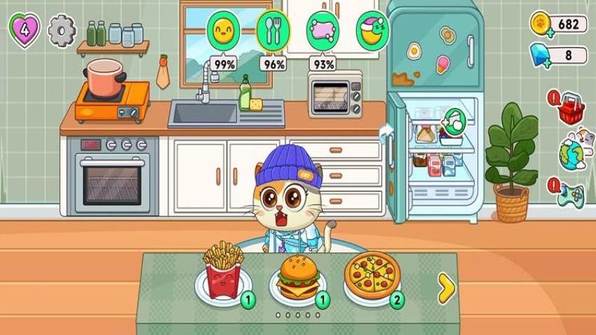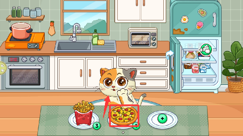 2、内置丰富烹饪功能,玩家可参照菜谱为猫咪制作多样美食,如香脆薯条、多层汉堡与特色披萨等。