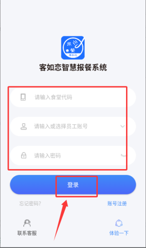 2、在登录页输入食堂代码、员工账号及密码,点击登录进入首页。