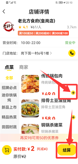 3、点选心仪菜品加入购物车,随后点击结算按钮。