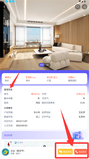 4、查看房源详情与周边配套,支持微信或电话联系。