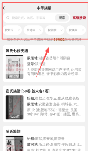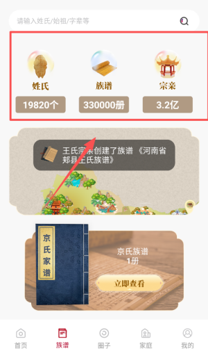 2、在搜索栏输入姓氏或字辈等关键词,检索关联的族谱信息。