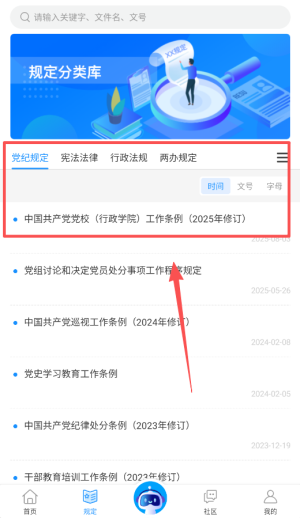 1、打开查规定app最新版,首页按宪法、行政法规、党纪规定等分类排列,点击对应大类,就能快速浏览该领域的所有法规文件。