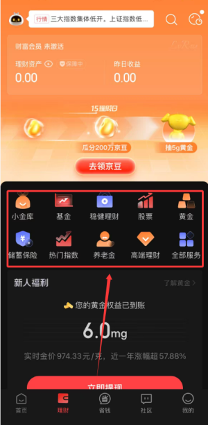 1、理财:小金库、明星基金、黄金积存金等品类齐全,兼顾风险谨慎理财