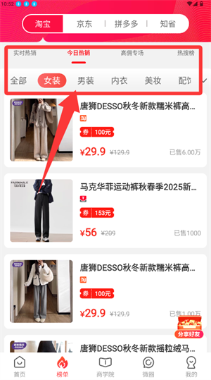 2、切换至榜单页面,筛选女装分类查看当前热门商品。
