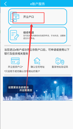 2、点击e账户服务板块可直接进入在线开立电子银行账户或数字钱包的申请与办理流程。