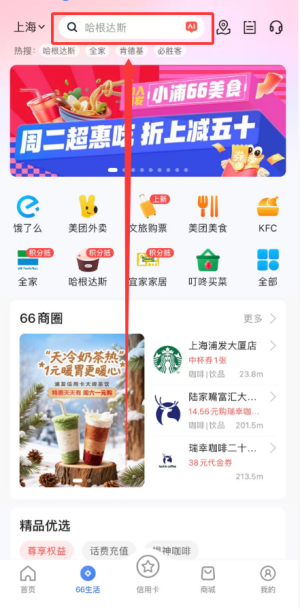 1、在66生活板块可以通过搜索功能快速查找附近商业圈或特定商户信息,以便获取消费指引与优惠活动。
