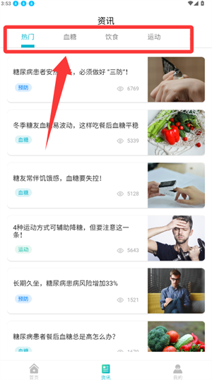 2、浏览资讯页分类,选择感兴趣的文章内容。