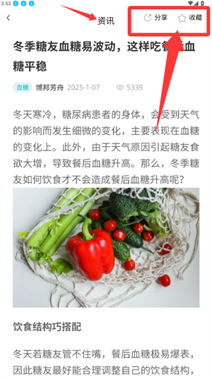 3、查看资讯详情,可使用分享或收藏进行互动。