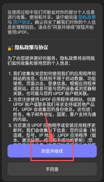 1、打开应用阅读隐私政策,点击同意并继续进入主界面。