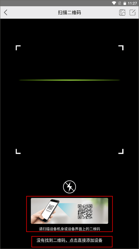 2、然后将扫描框对着设备机身或设备界面上的二维码,如果没有找到二维码,就可以点击下方的“直接添加设备”文字按钮。
