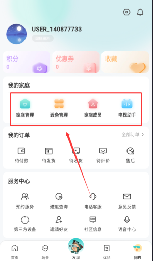 4、在个人页面中,可以管理家庭信息、控制设备、添加成员及使用电视辅助功能。