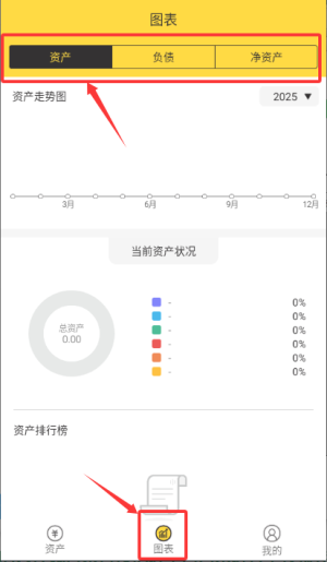 图表分析:资产,负债,净资产分类统计,用饼图、折线图、柱状图等,多维度帮你实时盘点资产状况,了解资产构成