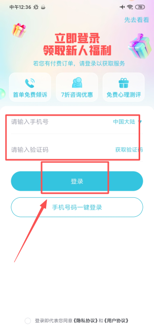 2、在登录页输入手机号验证码,勾选协议后点击登录完成。