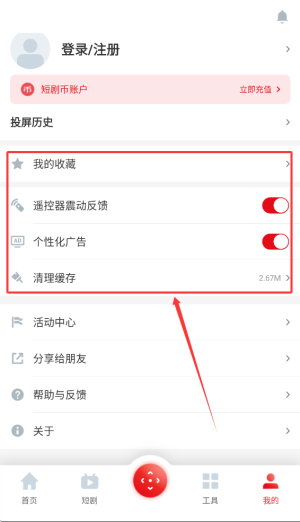 4、个人中心可管理收藏内容、设置遥控器震动反馈、广告偏好及清理缓存。