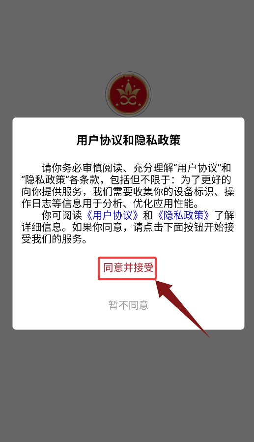 1、首次启动应用需点击同意并接受,确认后方可进入主界面。