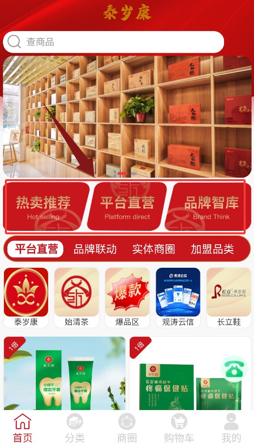 2、首页展示热卖推荐、平台直营商品及品牌智库等内容。
