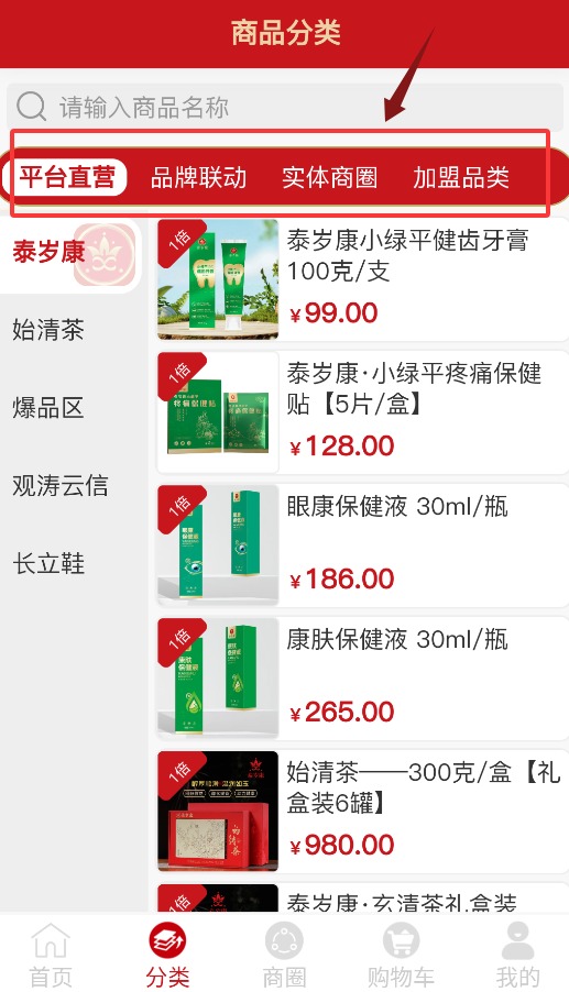 3、分类界面提供直营、品牌、实体商圈与加盟品类筛选。
