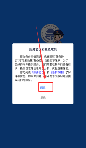 1、启动掌上城管应用,阅读服务协议与隐私政策后点击同意。