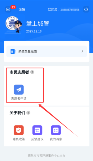 3、在市民志愿者板块可点击志愿者申请,参与城市管理服务。