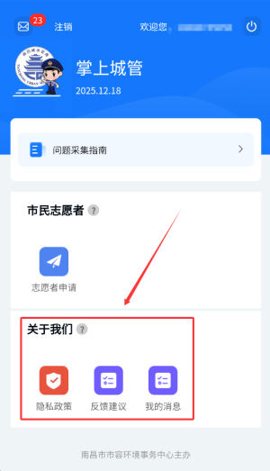 4、页面还提供隐私政策查阅、反馈建议提交及个人消息中心等常用功能入口。