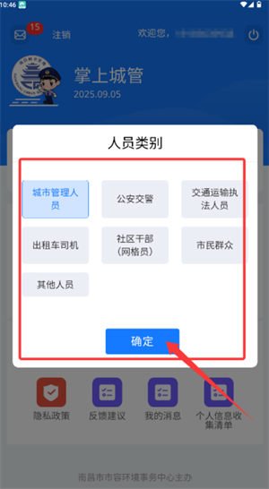 2、选择人员类别如城市管理人员,确认后进入对应功能界面。
