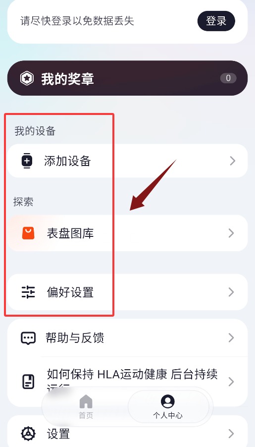 4、个人中心支持管理我的设备、探索表盘图库与调整偏好设置。