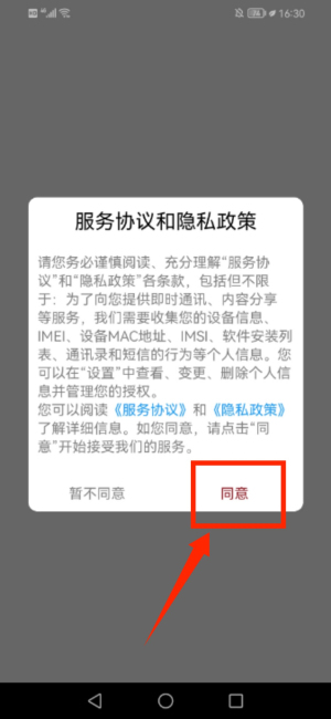 1、打开应用阅读服务协议,点击同意按钮进入主界面。