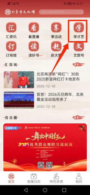 2、在主界面功能模块区域找到学才艺选项,点击进入页面。