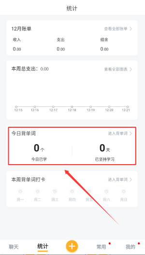 4、常用功能区域提供便捷的记账工具与快速进入背单词练习的快捷入口。