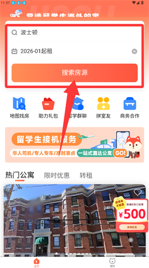 1、在首页搜索栏输入地点与时间,点击搜索获取房源。