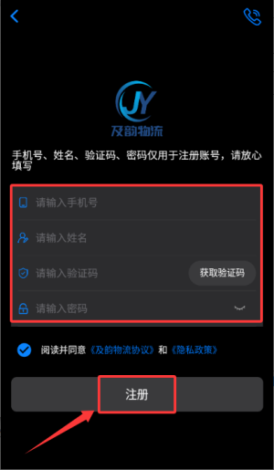 3、在注册页输入手机号姓名验证码密码,勾选协议点击注册完成。