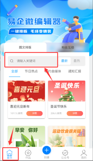 3、在首页搜索框输入关键词,即可查找图文排版模板资源。