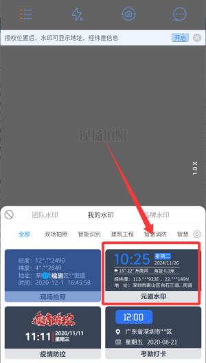 2、使用与管理水印,提供多行业水印模板库,用户可根据场景一键筛选并应用合适的模板至拍摄照片中。