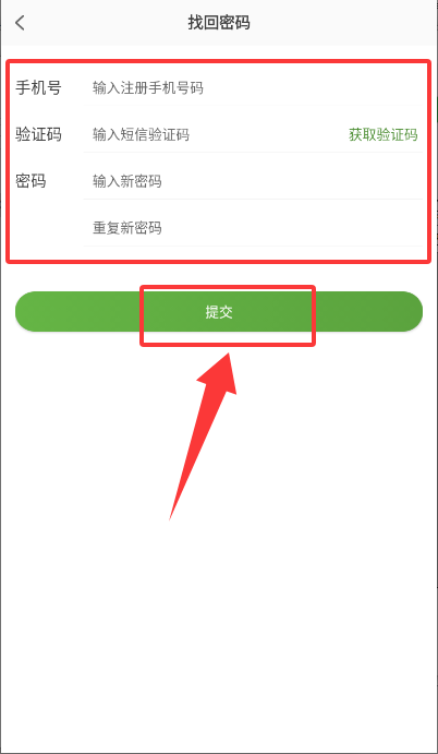 2、若需找回密码,在对应页面填写手机号验证码及新密码,点击提交完成重置。