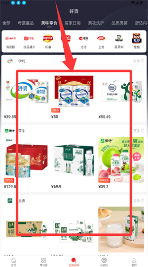2、进入好货界面,选择母婴或美食等目标品类。