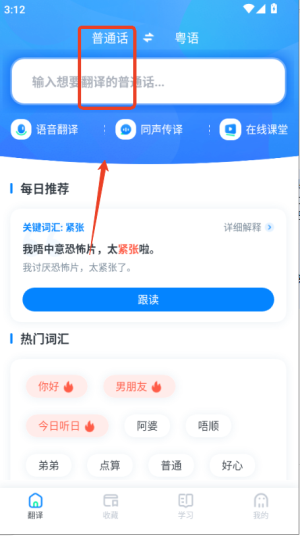 1、下载并打开粤语翻译帮app,在主界面选择“学习”或“翻译”核心功能入口。