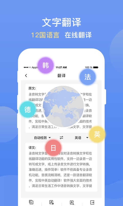 在线实时翻译、多种语言互译,专业智能!让语音翻译变得更加简单,再也不担心语言不通,多功能翻译:翻译录音、翻译软件、英语翻译、语音翻译、在线翻译、语言翻译器、对话翻译,中英翻译,日语翻译,韩语翻译,泰语翻译等;