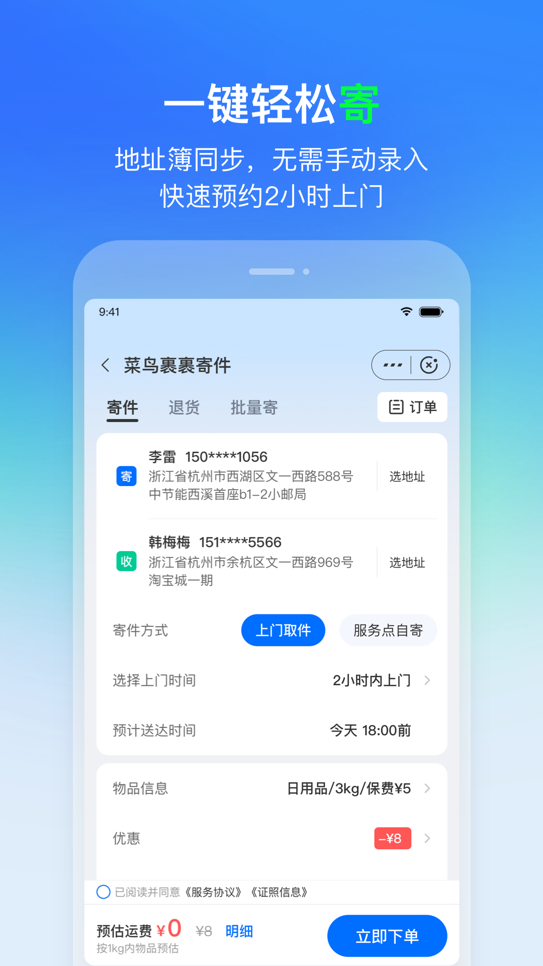 轻松寄件:足不出户就能轻松寄包裹,一键呼叫快递员,2小时上门服务;同时支持淘宝、天猫、闲鱼运费险商品免费退货,购物达人们从此任性买无忧退。