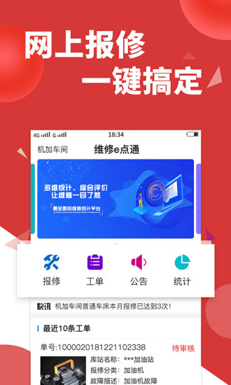 维修e点通是一款针对加油站设备维修申报而推出的手机软件,遇到设备故障或者需要维修时只需要在线报修就可以获得帮助啦,可以随时查看维修记录,各个环节无缝衔接,让用户能最快的体验到维修服务,快来下载使用吧!