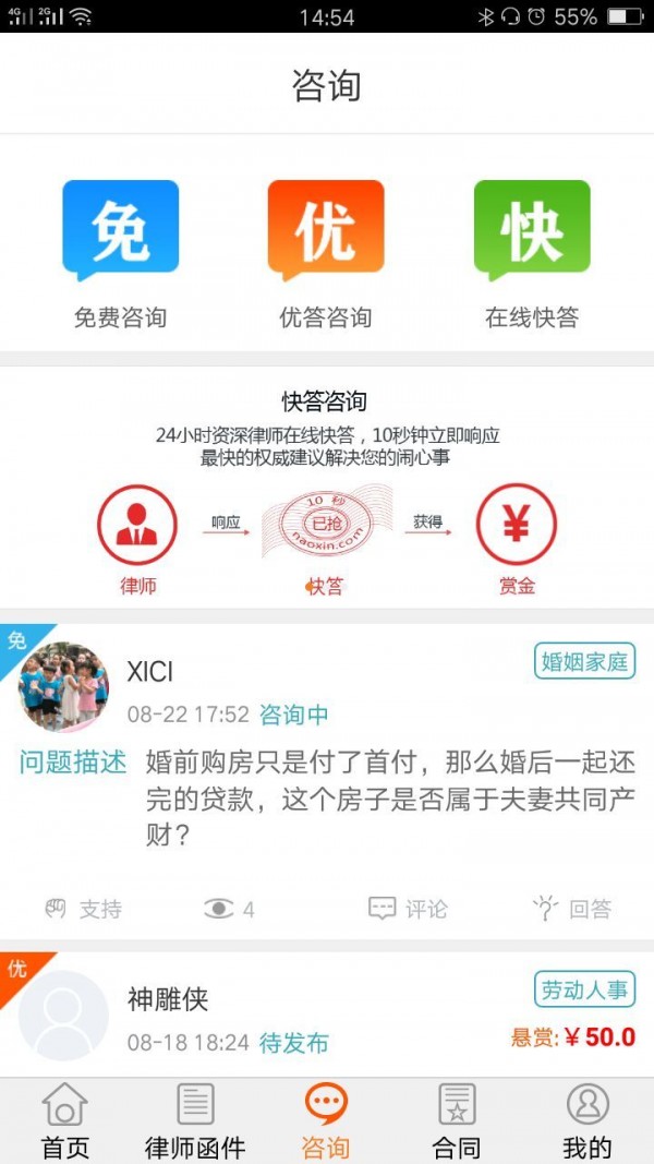 闹心律师app是一款提供在线法律咨询服务的应用软件,用户通过软件可以根据个人需求选择不同类型的法律咨询,软件还提供多种方式的咨询服务,如果用户不方便在线咨询,可以进行电话咨询,一对一沟通交流,快速解决用户的问题。 ;