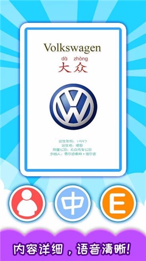 图文配音,通过音频讲解各类车标知识,辅助孩子学习各类车标知识;