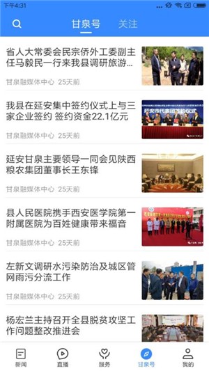 爱甘泉是为甘泉百姓准备的新闻资讯阅读软件,这里可以观看最新的时事还有本地资讯,让用户手机上就可以及时看到最新政治动态和民生生活,只需要输入关键字就可以查看自己想看的,还有直播新闻和各种服务等你体验哦,快来下载吧!
