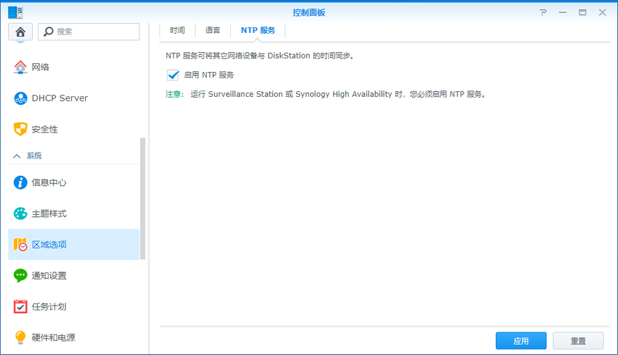 控制面板 — 》 区域选项 —》 NTP 服务 —》 勾选启用 NTP 服务;默认是没有勾选这个 NTP 服务;