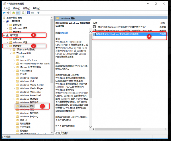 4、最后找到计算机配置--用户配置--管理模板--win更新再选择删除所有win更新功能,如下图: