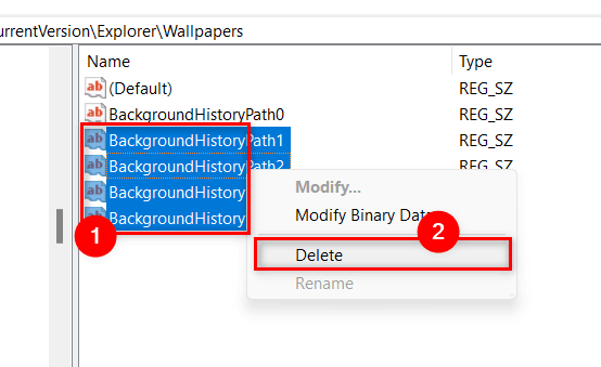 第 7 步:要清除或删除背景壁纸最近的历史记录,请按住CTRL键并单击它来选择要删除的所有背景历史记录路径字符串值。
