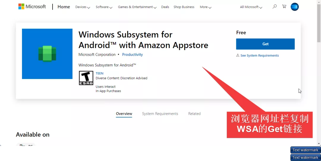 1. 首先,进入微软商店的WSA(安卓子系统)GET下载页面,复制网址备用;(WSA链接见文末)
