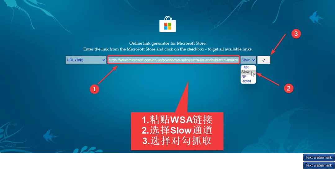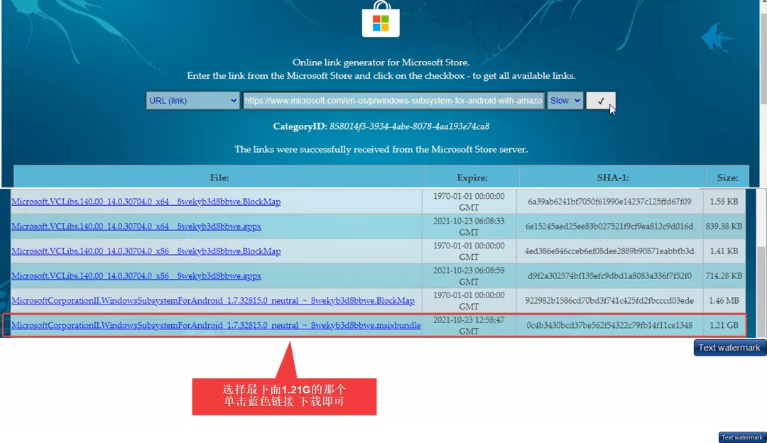 这里为大家安利一个安装包抓取网站(网址见文末);将刚才复制的WSA链接粘贴至此,选择Solw通道,下拉至最底部点击链接抓取下载;(提示:最下面1.21G的那个)